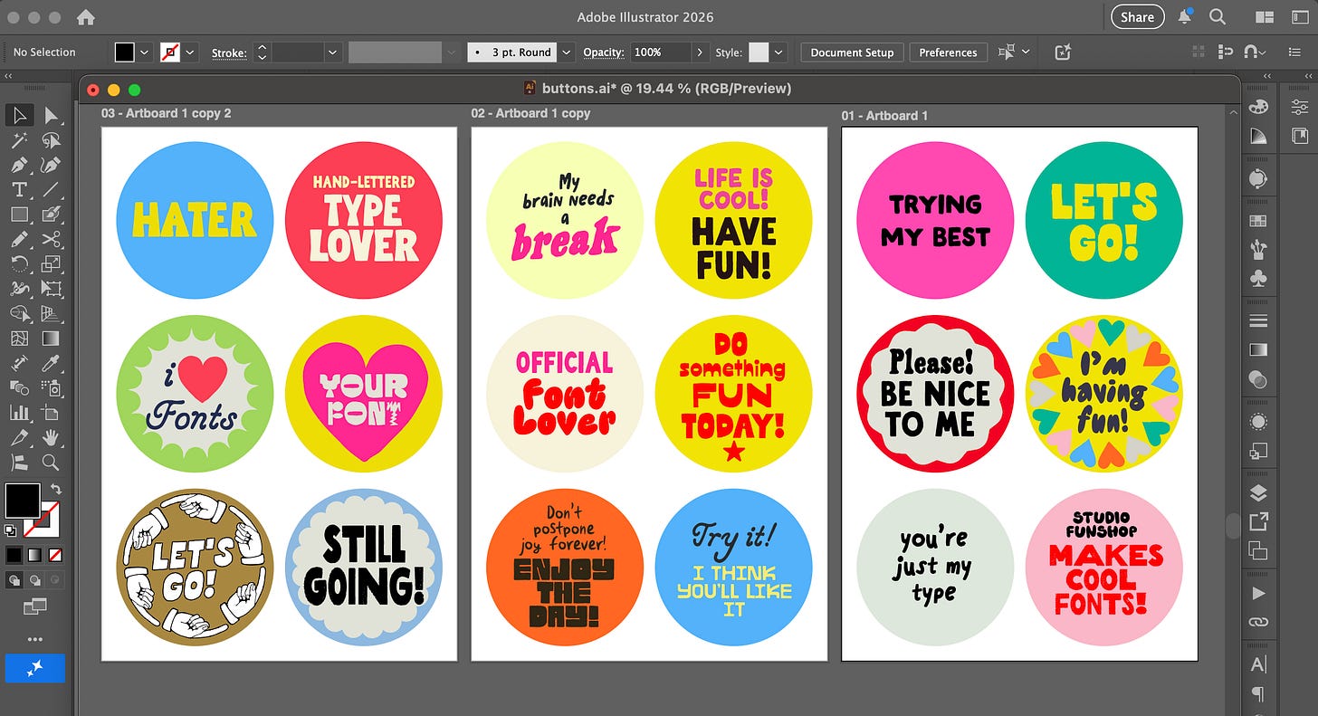 Here are the illustrator designs. And below are the vector designs mocked up as buttons! All fonts available. Please Enjoy.